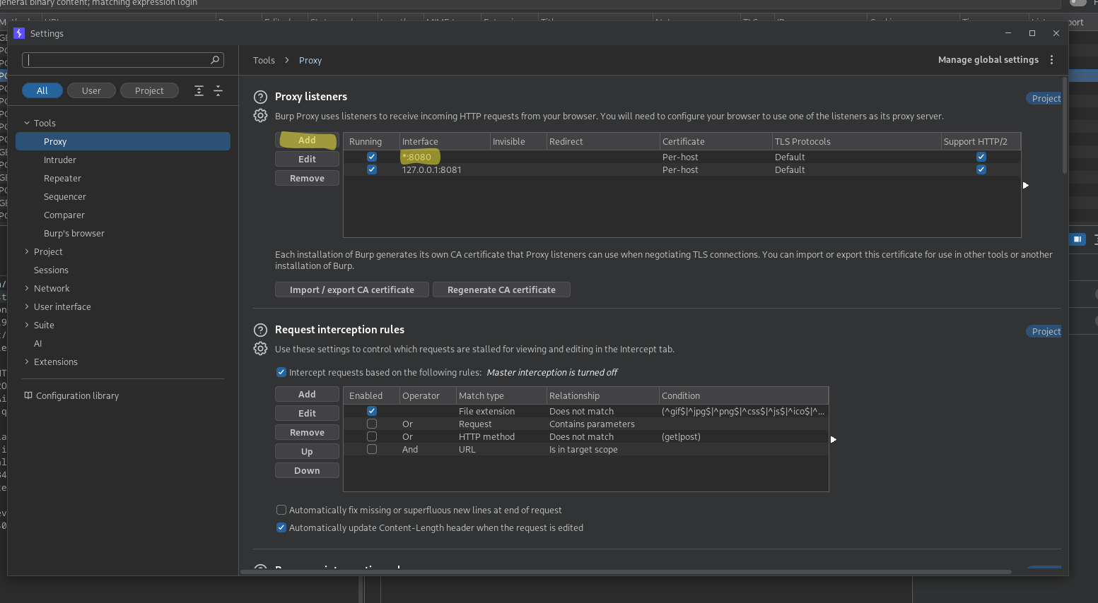 The key here is configuring Burp Proxy to listen on all interfaces (*). This allows Burp to receive traffic coming from outside the localhost environment, including your mobile device.