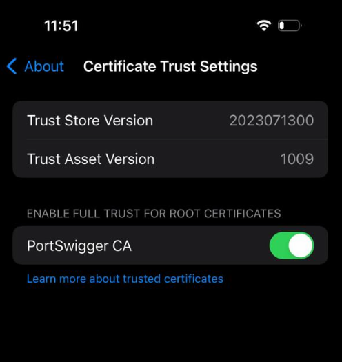 - Then go to Settings → General → About → Certificate Trust Settings.